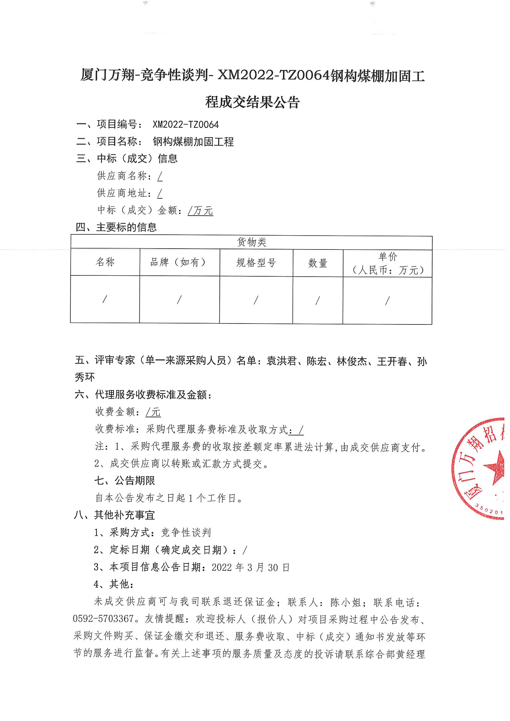 廈門萬翔-競爭性談判-XM2022-TZ0064鋼構(gòu)煤棚加固工程成交結(jié)果公告